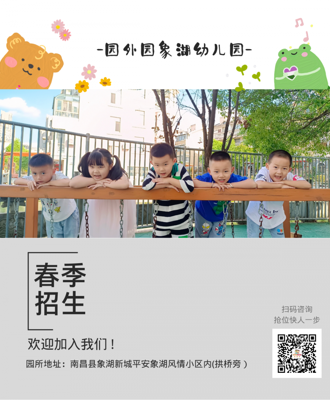 園外園·象湖園創(chuàng)辦于2016年9月,坐落于南昌市南昌縣平安象湖風(fēng)情小區(qū)內(nèi)。園所占地面積3000平方米,建筑面積4150平方米。設(shè)有大班、中班、小班、寶寶班共12個(gè)班級(jí),收托3-6歲幼兒360人??