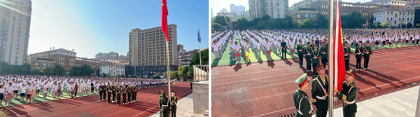 護旗隊邁著整齊的步伐,莊嚴走向升旗臺,伴隨著莊嚴的《義勇軍進行曲》,鮮艷的五星紅旗在陽光下冉冉升起,全體師生莊嚴肅立。