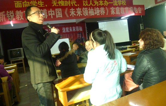 1月17日上午,南昌現(xiàn)代外國語學校(迎賓校區(qū))在圖書館組織開展了一場別開生面的家庭素質(zhì)教育“報告會”。學校特別邀請中國第一本青少年成功學和父母成功學《改變就在瞬間》的作者傅中國到校,現(xiàn)場向家長們演示了如何幫助孩子找回學習樂趣及動力,如何激發(fā)孩子的學習潛能創(chuàng)造學習奇跡,向家長演示如何把握教子成功成才的關鍵要素,如何有效激勵孩子改變自己。