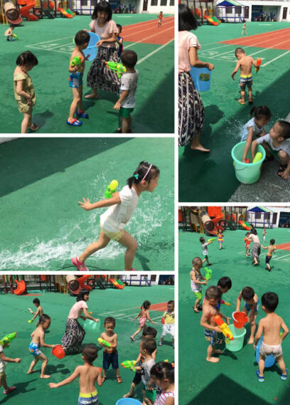 小朋友們從家里準備了打水仗的用品:泳衣、泳鏡、水槍、換洗衣物等,興奮地來到一樓大操場,隨著音樂開始熱身運動。