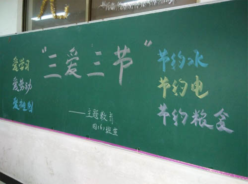 各班以班級為單位都開展了“三愛 三節(jié)”主題班會活動?;顒有问蕉鄻?,有的以知識競答方式普及生活中的三愛三節(jié)知識,有的用多媒體播放愛學習、愛勞動、愛祖國的典型事例;有的以演講形式聯(lián)系身邊節(jié)水、節(jié)電、節(jié)糧的故事進行講解,闡述自己的收獲;有的制作手抄報反映自己對“三愛三節(jié)”的理解。