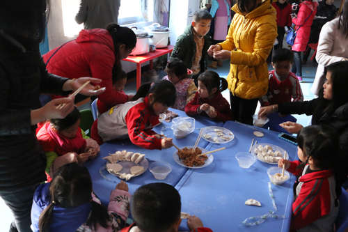 親子游戲結(jié)束后,家長和孩子們幸福地圍坐在一起調(diào)餡、包餃子。在各位家長的指導(dǎo)下,孩子們小心翼翼的學(xué)著包餃子:仔細(xì)的放餡,輕輕的捻餃子皮,可認(rèn)真了!一個個富有創(chuàng)意的餃子在孩子們手中綻放。整個活動歡聲笑語,其樂融融,流淌著暖暖的親情,洋溢著濃濃的節(jié)日氣氛??粗约和瓿傻淖髌?,吃著自己包的餃子,孩子們的臉上露出了得意興奮的表情。