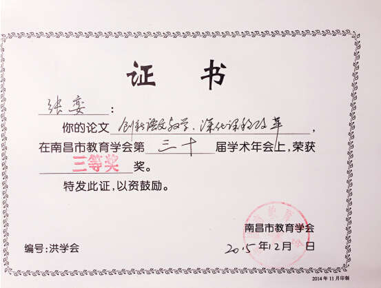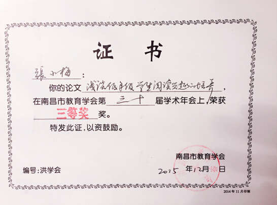 南昌現(xiàn)代外國語學(xué)校(象湖校區(qū))長期注重發(fā)揮教育理論的引領(lǐng)作用,通過搭建各類信息平臺(tái),指導(dǎo)教師將教育理論與教育教學(xué)實(shí)踐緊密結(jié)合。廣大教師始終注重課堂教學(xué)效益,不斷提升教學(xué)實(shí)踐水平和教學(xué)研究水平,教學(xué)之余積極參與各種論文征集、交流、發(fā)表活動(dòng)。近日,在南昌市教育學(xué)會(huì)第三十屆學(xué)術(shù)年會(huì)上,我校張小梅老師撰寫的論文《淺談低年級(jí)學(xué)生閱讀興趣的培養(yǎng)》和張孌老師撰寫的論文《創(chuàng)新語文教學(xué),深化課程改革》,榮獲三等獎(jiǎng)。希望獲獎(jiǎng)教師再接再厲,繼續(xù)為推動(dòng)學(xué)校教研工作而努力,同時(shí)也希望其他教師能積極撰寫論文,參與各級(jí)各類的論文評(píng)比活動(dòng),為全面推進(jìn)學(xué)校發(fā)展作出貢獻(xiàn)。