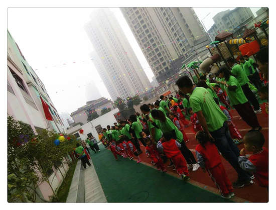 11月19日9:30分,主持人宣布親子運動會開始,首先向主席臺走來的是護旗隊:他們是大班的驕傲,他們正邁著整齊、矯健的步伐向主席臺走來。他們秉承奧運精神:更快、更高、更強!