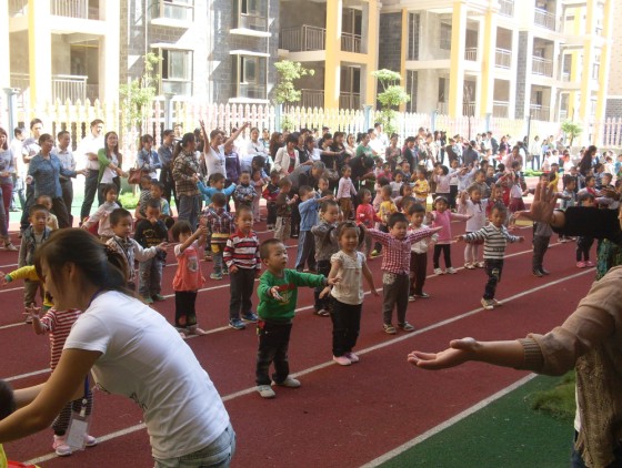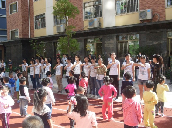 9月29日,在迪斯尼幼兒園、園外園幼稚園的操場上,響起了早操律動音樂,可愛的寶寶們在操場上跟隨著老師們的步伐,蹦蹦跳跳起來。在老師的帶動下,在場的家長們也紛紛加入進(jìn)來,和寶寶們一起又唱又跳。迪斯尼幼兒園的老師們表演了民族舞《天藍(lán)藍(lán)》,還進(jìn)行了古箏、個人舞的才藝表演,展示了幼兒園老師們朝氣蓬勃的精神面貌。園外園幼稚園的老師們也不甘示弱,在現(xiàn)場以特有的方式展現(xiàn)了幼兒園的承諾、愿景、文化。
