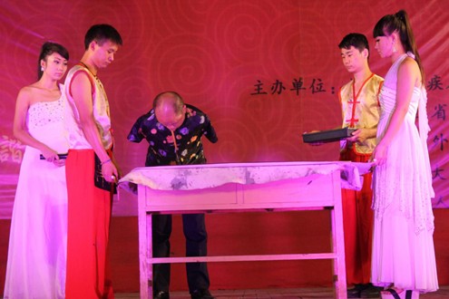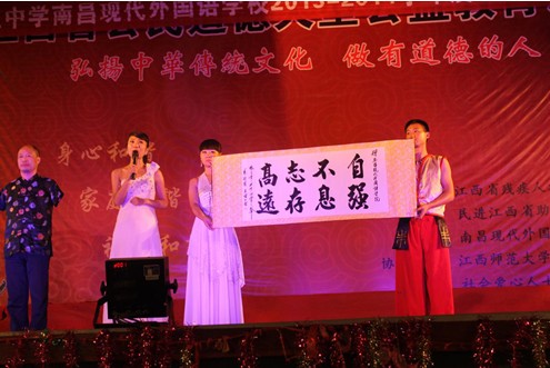 演出中,校長(zhǎng)涂序健上臺(tái)接受了“心靈之聲”藝術(shù)團(tuán)贈(zèng)送的墨寶《志存高遠(yuǎn)》,并代表全校師生對(duì)參加表演的殘疾演員表示衷心的感謝并致以崇高的敬意。
